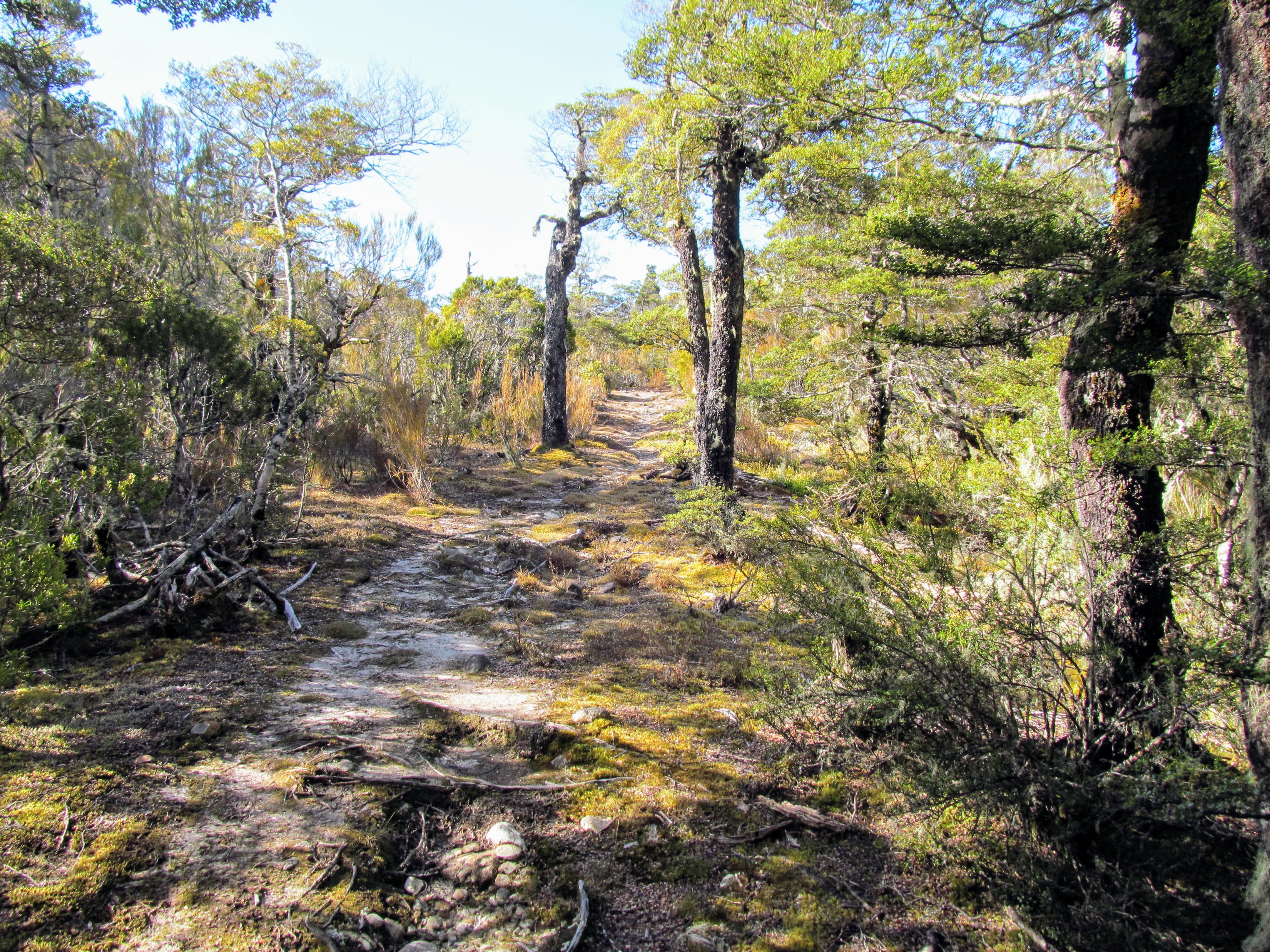 The track past Surprise Stream is initially steep but evens out after a kilometer or so into a rough but mostly flat sidle track. There are some root ladders to climb and you need to climb over a bit of wind fall as the track needs a good tidy up...